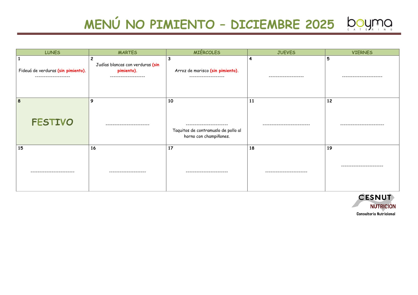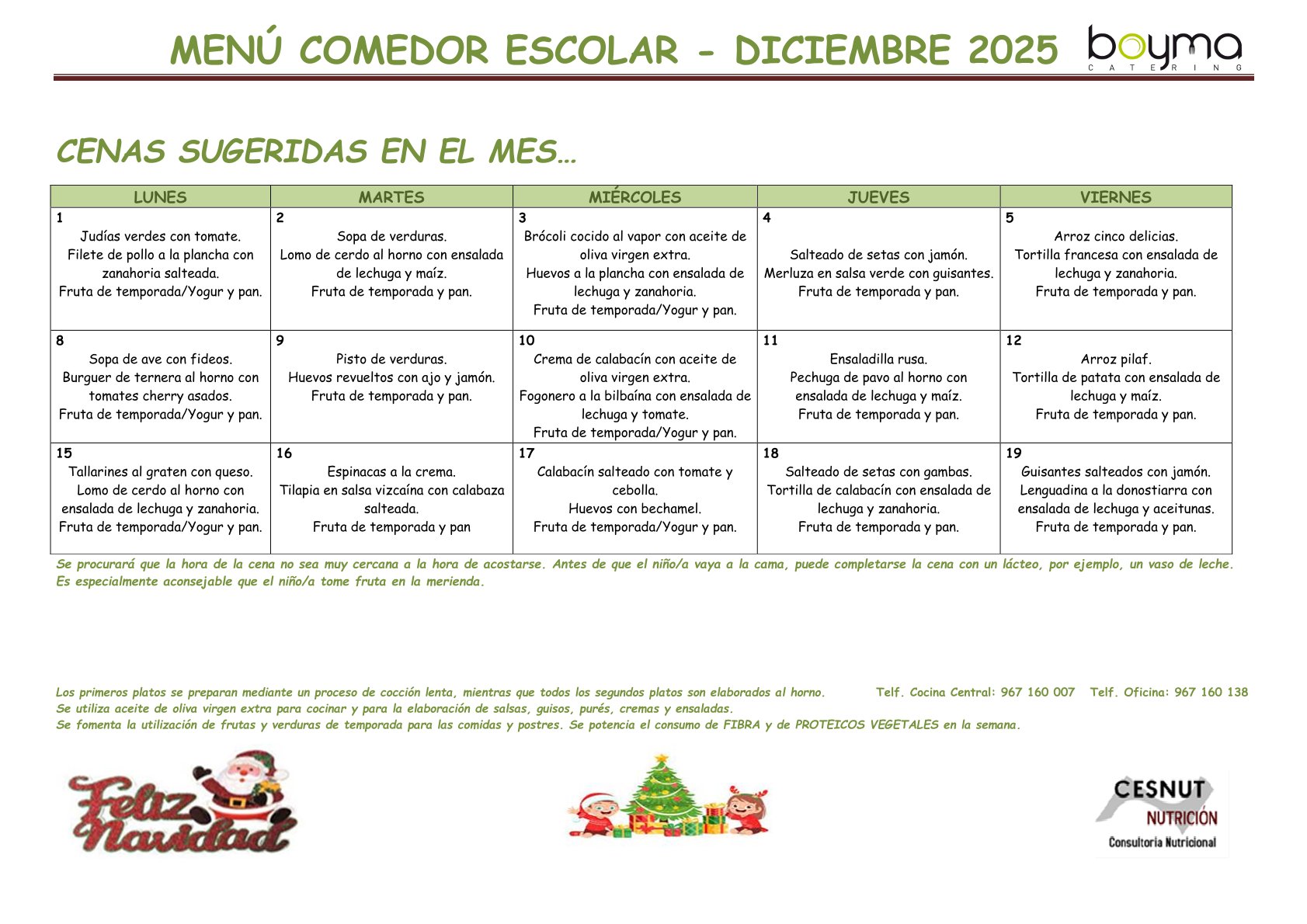 Menús escolares del comedor para este mes de diciembre de 2025.